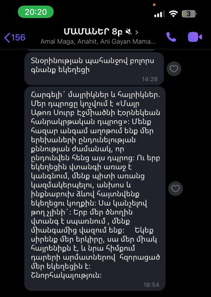 Մեր ձեռքի տակ հայտնվել է բացառիկ ձայնագրություն, որտեղ դպրոցականների ծնողներից տնօրինության պահանջով պարտադրում են գնալ եկեղեցի։